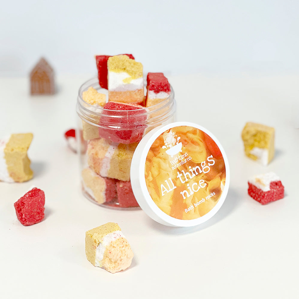 For cosy, happy Christmas bathtimes, these 'All Things Nice' bath rocks are a colourful mix of red, yellow and orange, from our festive Gingerbread theme. Throw them all in the water for a colourful explosion (we recommend this to guarantee squeals of delight) or use a few rocks at a time for a more subtle colour effect.