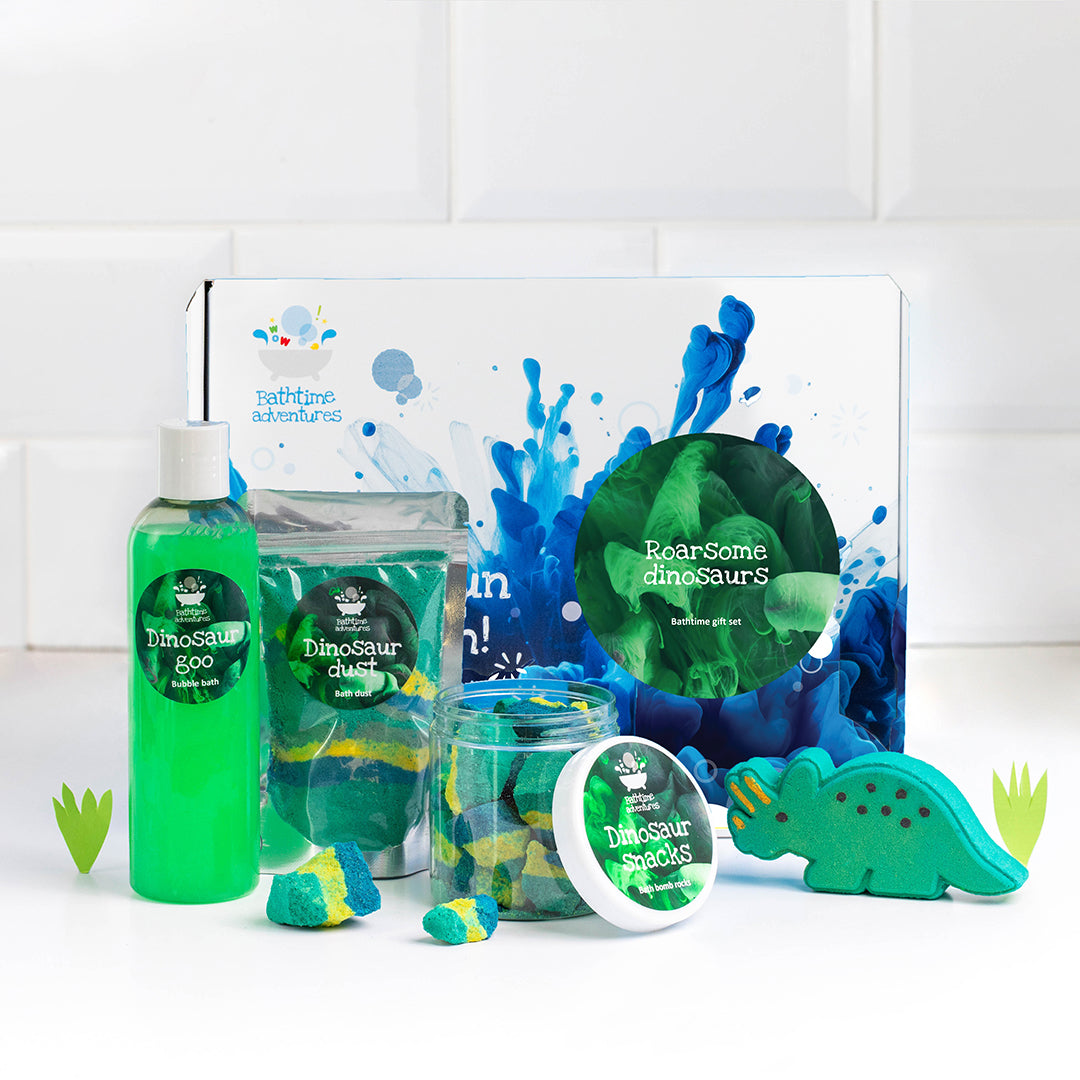 A roarsome, dinosaur-themed bundle of kids bath products, the perfect choice for your budding little paleontologist. Packed FULL of adventure and reptilian fun, this 4-piece bundle contains: