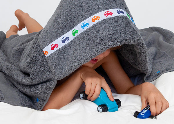 Wrap them up in our big, snuggly, organic cotton towels, with an extra thick hood and pop-fastener to keep the towel closed like a poncho for warmth and privacy.
