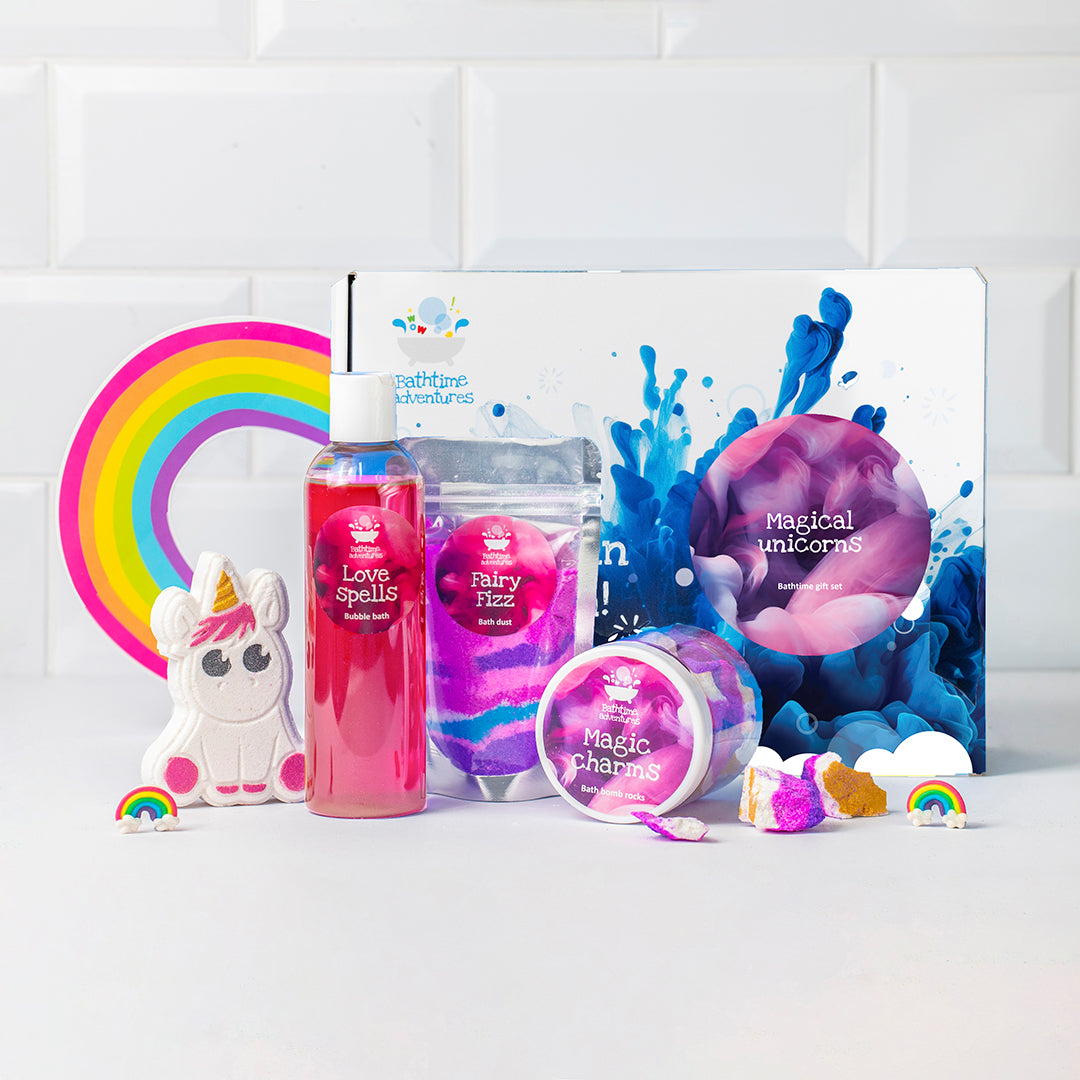 A magical unicorn-themed bundle of kids bath products, this pretty set is packed full of pink, purple and gold glitter bath treats- quite possibly THE perfect bath bundle for any little unicorn fan.