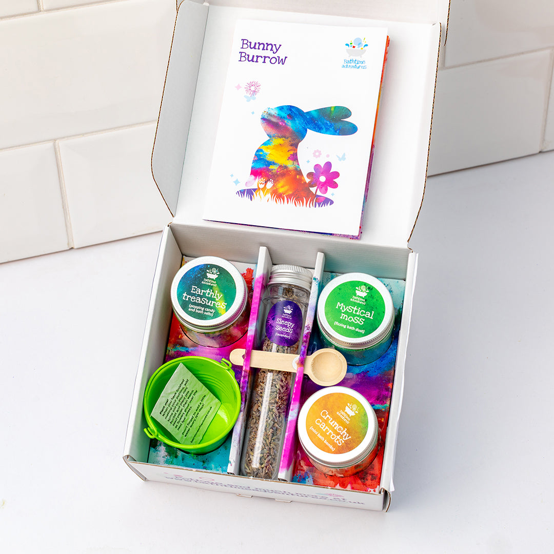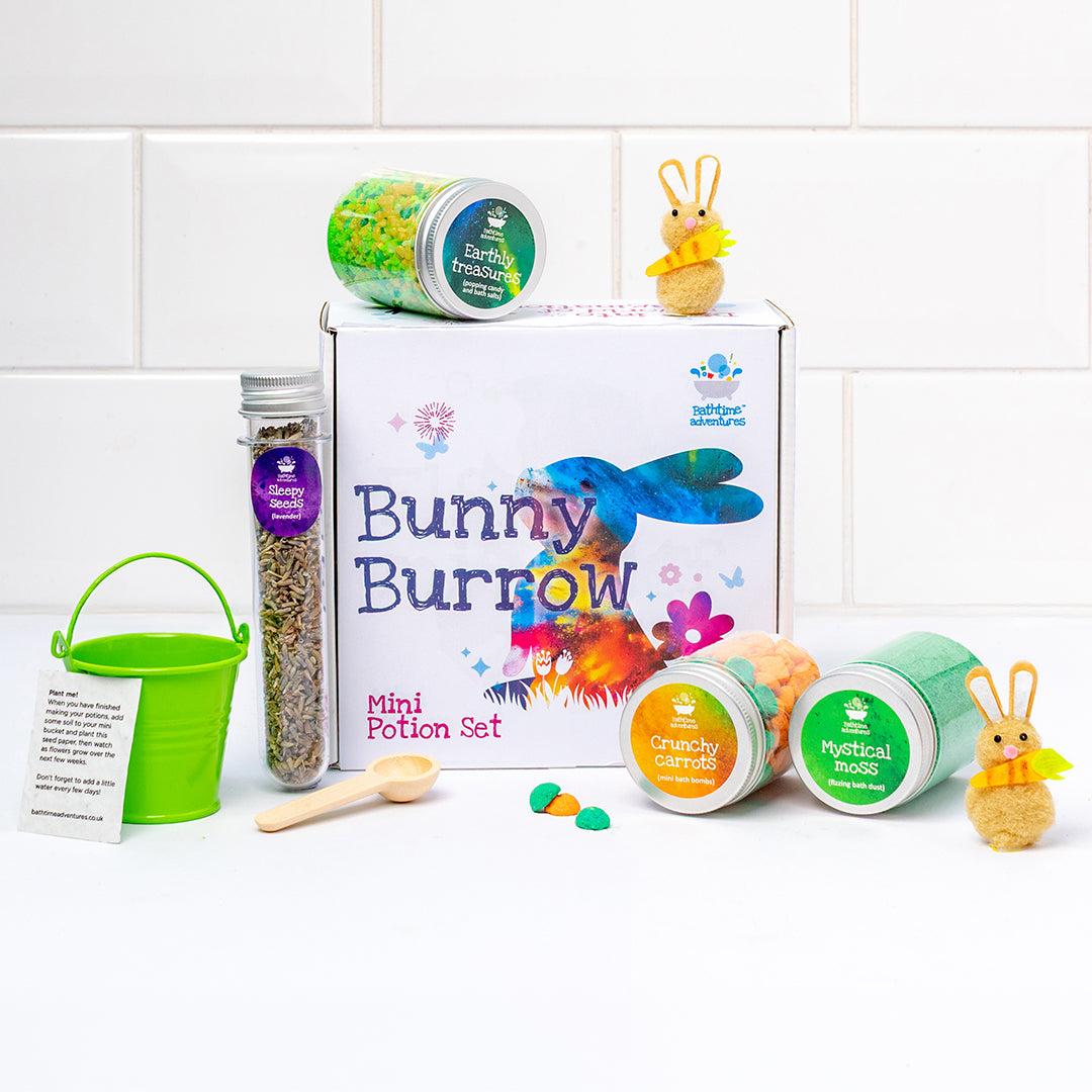 Dive into a world of imagination with our Bunny Burrow springtime mini potion kit! This special edition is a great way to create some magical moments with your little ones this holiday. A hands-on adventure full of storytelling, sensory play, and splashes of colour, it’s designed for magical messy play or bath time fun. Whether as a special gift or a shared adventure, this kit is sure to fill your home with excitement, magic, and a touch of bunny-approved magic!